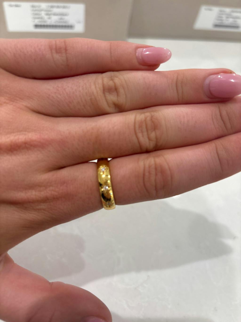 1. Wrap a strip of paper around your finger where you'd like your ring to be. Tip: For more accuracy, trim the strip of paper to match the width of the ring.2. Make sure that the paper is pulled firm against your finger.
